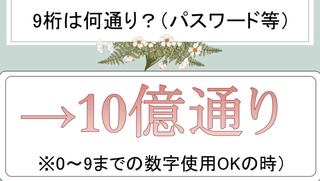数字のみの9桁のパスワードは、0から9までの10個の数字を使用できます。組み合わせの計算は以下の通りです:
