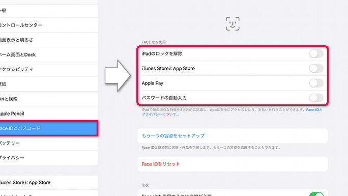 - 「Face IDとパスコード」または「Touch IDとパスコード」を選択します。