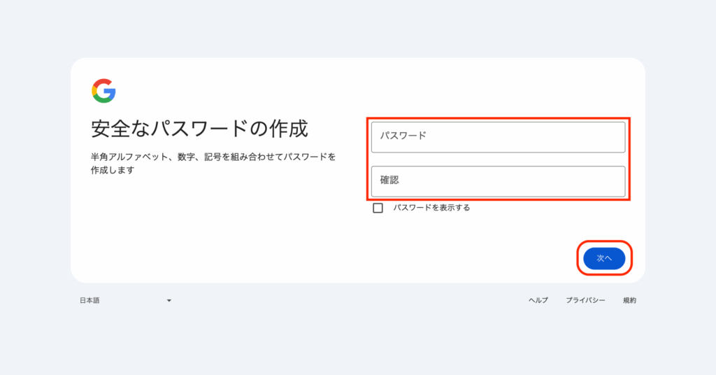 - 同じパスワードを再度入力して、一致するか確認。