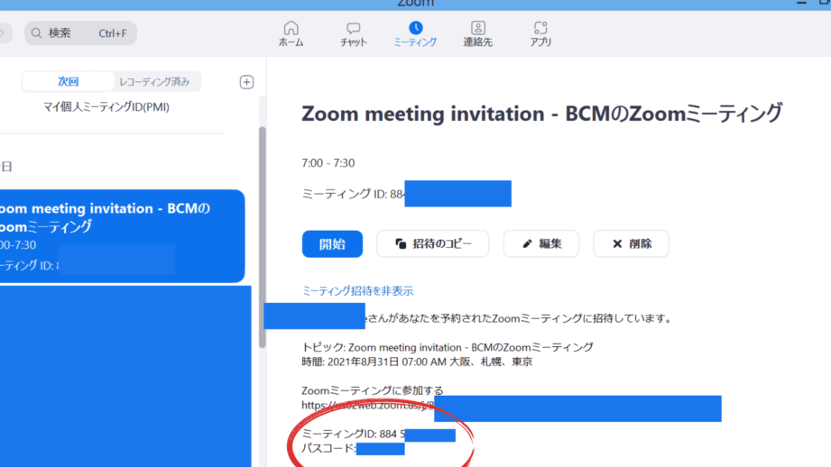 - 「ミーティングパスワード」を確認する。