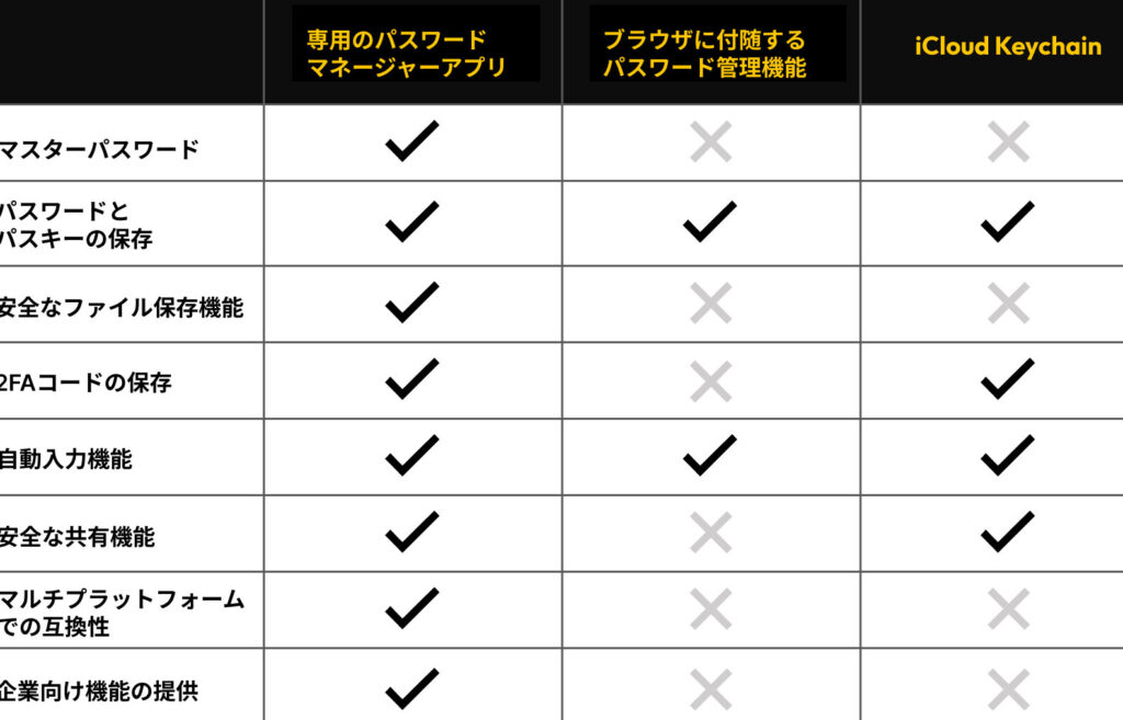 各種のパスワードマネージャーが提供する機能を理解し、適切なものを選ぶことで私たちのオンラインセキュリティは大きく向上します。デジタルセキュリティの強化に向けて、パスワードマネージャーの導入をぜひ検討してみてください。