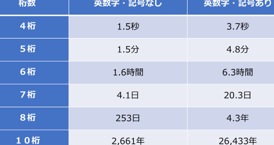 - 対象のパスワードの長さを考慮する:4桁の場合、約1万通り。6桁で約100万通り。