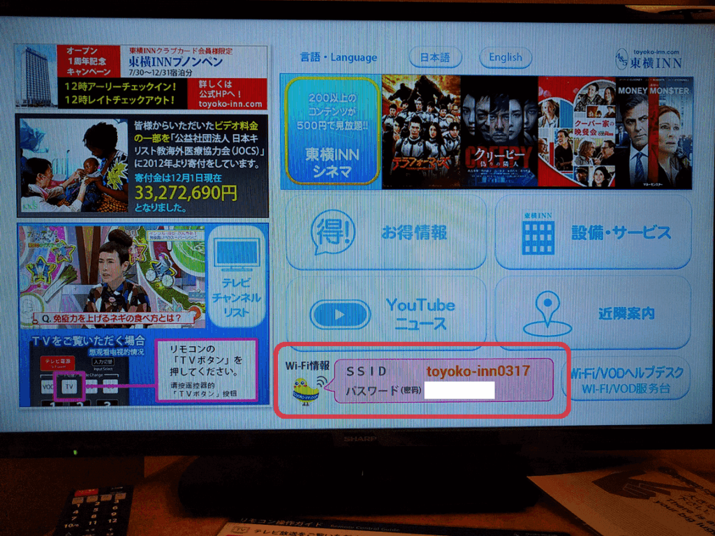 - パスワードを入力する。フロントデスクまたは客室内の案内書から確認したパスワードを使用します。