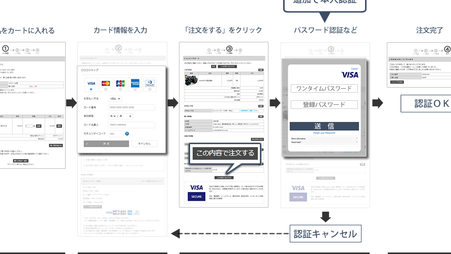 取引の認証プロセスは、多層的なセキュリティ機能を提供します。このプロセスにより、オンラインショッピング中に不正アクセスを防ぎます。具体的な流れは以下の通りです。