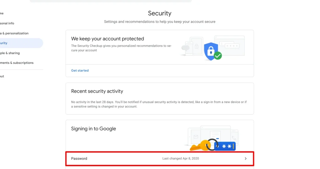 - 「セキュリティ」をクリックします。このセクションではアカウント保護に関する設定が見つかります。