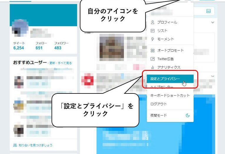 - 設定メニューを開く。プロフィールアイコンをクリックし、「設定とプライバシー」を選択します。