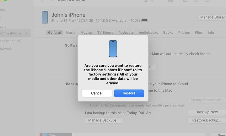 - 「iPhoneを復元」を選択する – 表示された選択肢から「iPhoneを復元」を選びます。
