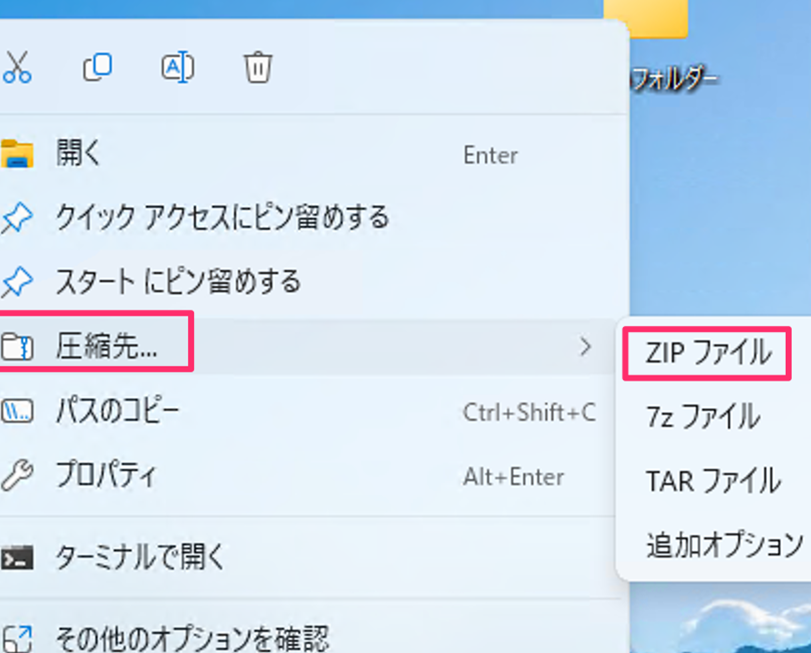 メニューから「圧縮」を選択し、使用するソフトウェアのオプションをクリックします。